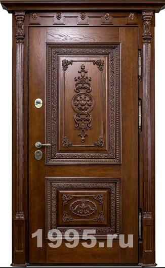 Стальная дверь с массивом дуба, резьбой и карнизом