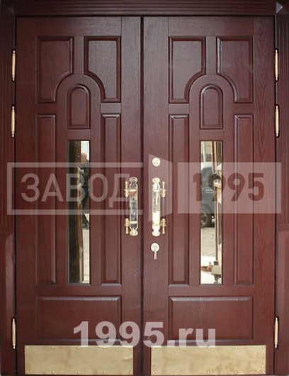 Предлагаемая модель дверного блока – изделие премиальной категории. В отделке применены филенчатые МДФ-панели. В качестве декора использованы зеркальные вставки и полированные металлические листы в нижней части полотна. Входные металлические двери МДФ данной модели хорошо впишутся в обстановку элитного загородного дома или ресторана высокого класса. Взломостойкость изделия достигается благодаря сочетанию конструктивных методов и надёжной фурнитуры. Толщина металла полотна составляет 2 мм. Для защиты от силового взлома предусмотрены противосъемные фиксаторы створок. В базовой версии данный дверной блок оснащён двумя российскими замками с механизмами разного типа. Комплектация изделия, как и габариты, может быть изменена заказчиком.