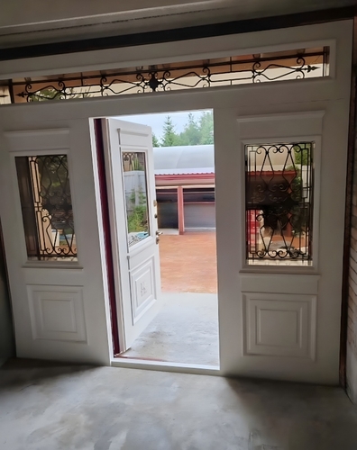 Двустворчатая дверь МДФ с карнизом, с остеклением и коваными решетками